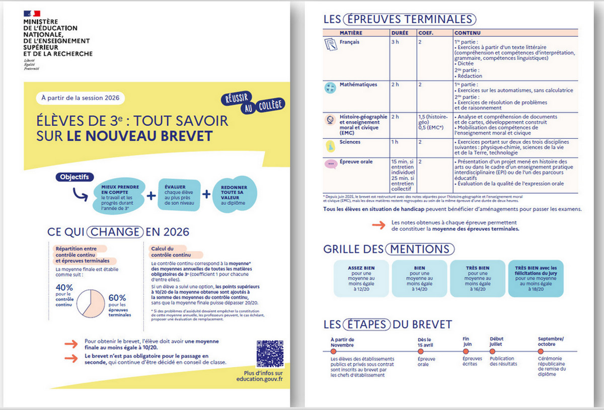 Sur le site de l’Education Nationale, vous trouverez résumées les nouvelles modalités de passage du Brevet de Collèges, session 2026.